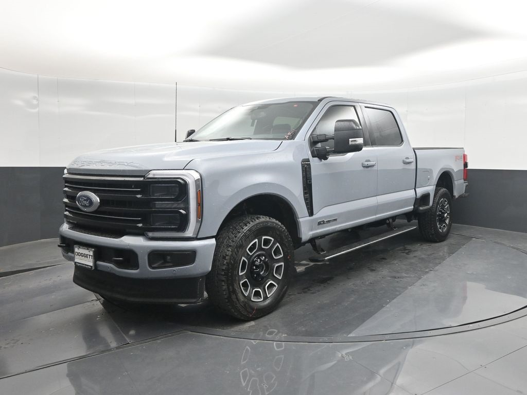 Glacier Gray Metallic Tri-Coat 2026 Ford F-250SD Platinum 4WD 10-Speed Automatic Power Stroke 6.7L V8 DI 32V OHV Turbodiesel , F-250 >10K GVWR Package, Ford Connectivity Package (1-Year Included), FX4 Off-Road Package (Hill Descent Control, Off-Road Specifically Tuned Shock Absorbers, and Unique FX4 Off-Road Box Decal), 4-Wheel Disc Brakes, 410 Amp Dual Alternators, ABS brakes, Adjustable pedals, Air Conditioning, Alloy wheels, AM/FM radio: SiriusXM with 360L, Auto High-beam Headlights, Auto-dimming Rear-View mirror, Automatic temperature control, Brake assist, Compass, Delay-off headlights, Driver door bin, Driver vanity mirror, Dual front impact airbags, Dual front side impact airbags, Electronic Stability Control, Emergency communication system: SYNC® 4 911 Assist, Flow-Through Console, Front anti-roll bar, Front Bucket Seats, Front Center Armrest, Front dual zone A/C, Front fog lights, Front License Plate Bracket, Front reading lights, Fully automatic headlights, Garage door transmitter, Heated door mirrors, Heated front seats, Heated rear seats, Heated steering wheel, Illuminated entry, Low tire pressure warning, Memory seat, Navigation system: Connected Navigation, Outside temperature display, Overhead airbag, Overhead console, Panic alarm, Passenger door bin, Passenger vanity mirror, Pedal memory, Power door mirrors, Power driver seat, Power passenger seat, Power steering, Power windows, Radio: B&O Unleashed Sound System by Bang & Olufsen, Rain sensing wipers, Rear reading lights, Rear seat center armrest, Rear step bumper, Rear window defroster, Remote keyless entry, Security system, SiriusXM w/360L, Speed control, Split folding rear seat, Steering wheel mounted audio controls, SYNC® 4 w/Enhanced Voice Recognition, Tachometer, Telescoping steering wheel, Tilt steering wheel, Traction control, Trip computer, Turn signal indicator mirrors, Twin Panel Power Moonroof, Upfitter Switches (6), Variably intermittent wipers, and Ventilated front seats.